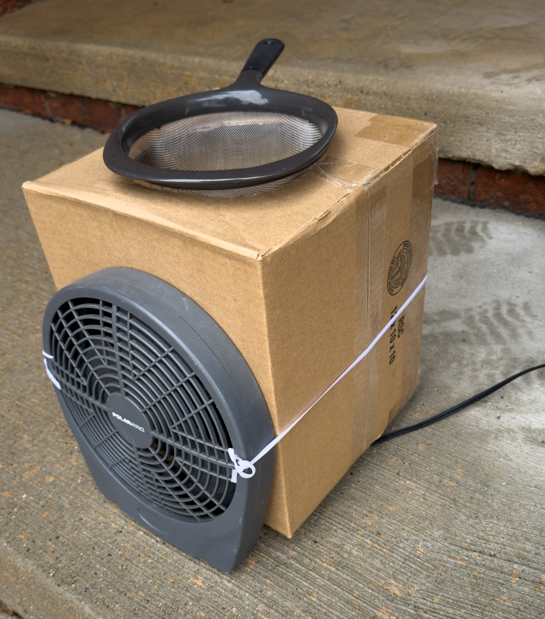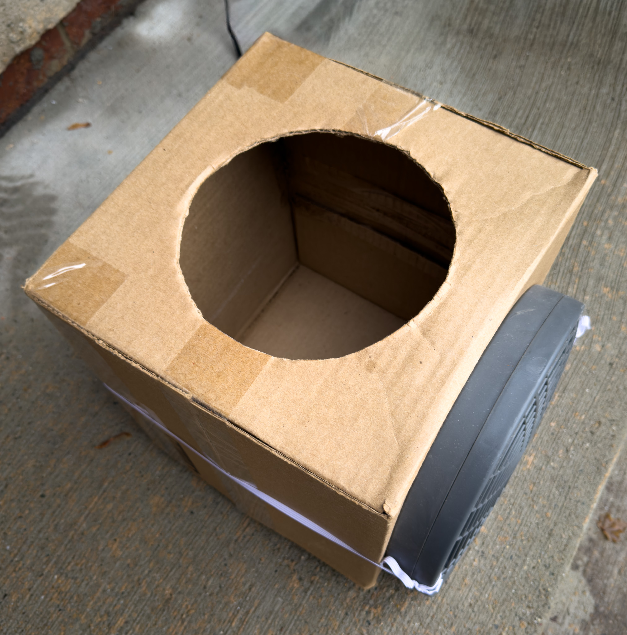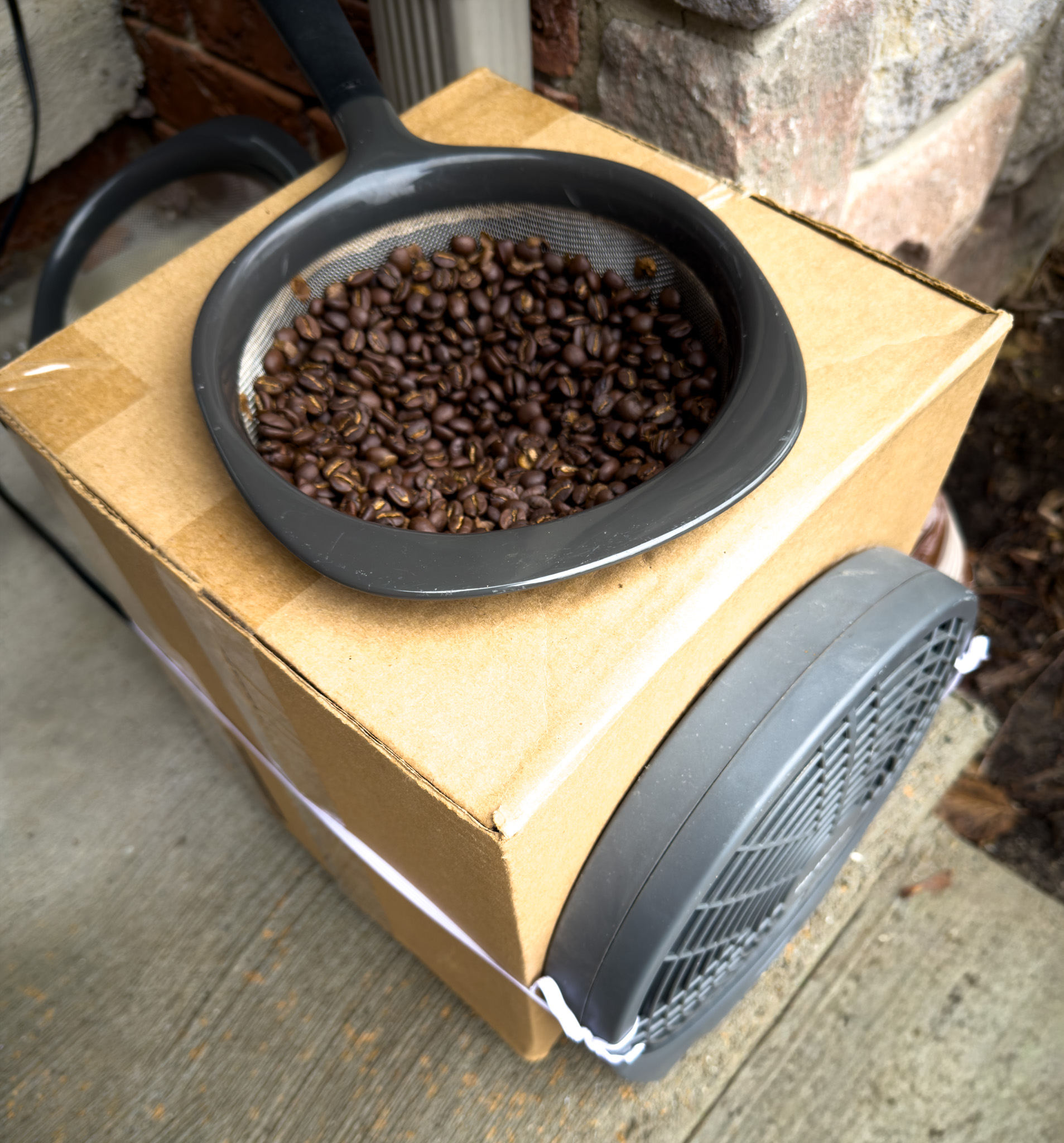 - I empty my bean drum into a chiller I made. It's a 12-inch-cube cardboard box, with a large hole in top that a mesh collander fits into (like an OXO Good Grip), and a large hole in one side that a fan fits into. The fan is blowing outward, pulling air in through the beans to cool them off. I spread the beans out within the collander so all air entering the box is forced to go through some of the beans. It takes about 3 or 4 minutes to cool 8-ounces of beans down to room temperature.