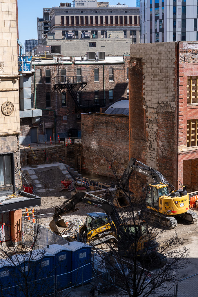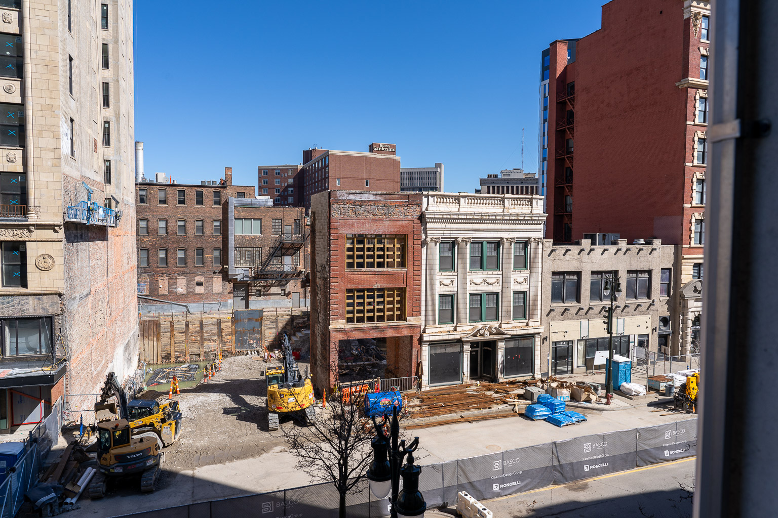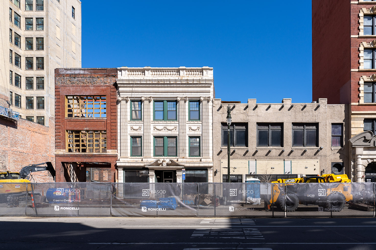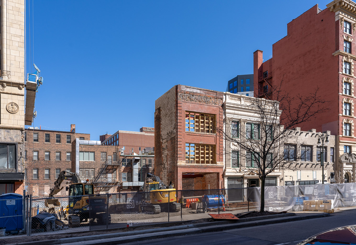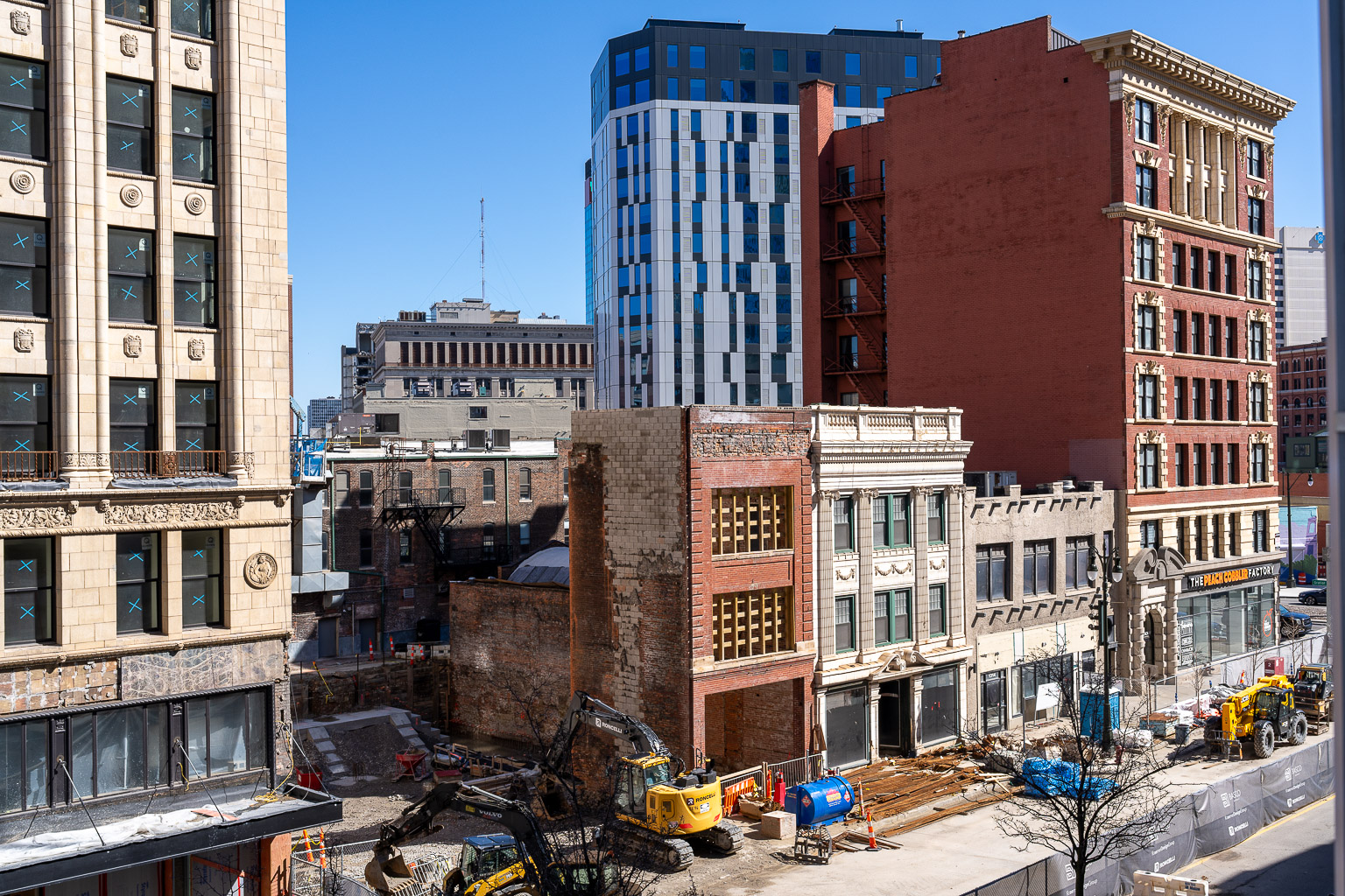 DSC09413-20260308: Left to right: Harvard Square Center (partial, at left edge), Michigan Cut Flower Exchange (demolished), Reckmeyer Building (just a shell), MacDiarmid Candy Company, John Breitmeyer’s Sons, and the Breitmeyer-Tobin Building (at right edge), on March 8, 2026