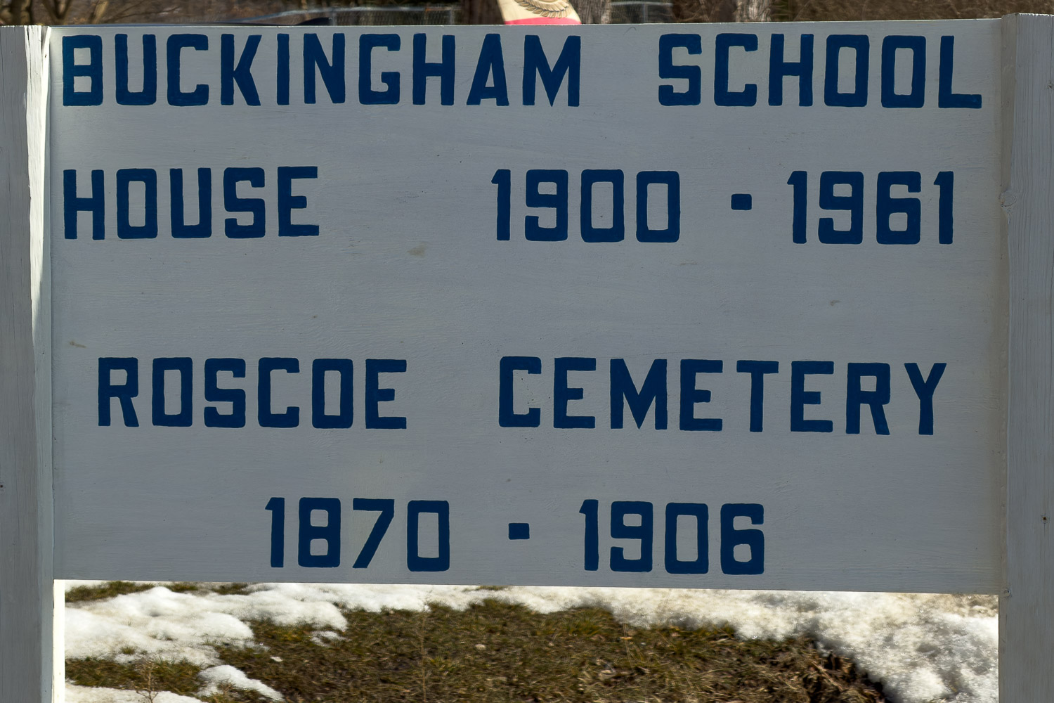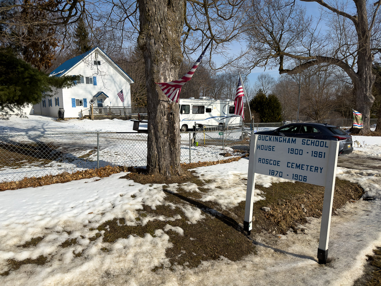 Buckingham School is now a private residence owned by a very proud husband and wife who have done a lot to learn the history of their home as a schoolhouse and the adjacent cemetery and the surrounding region. They proudly display a schoolhouse sign (1st and 2nd photos below) along the street, asked me to go ahead and publish their address on this page so you can drive past the home if you'd like to.