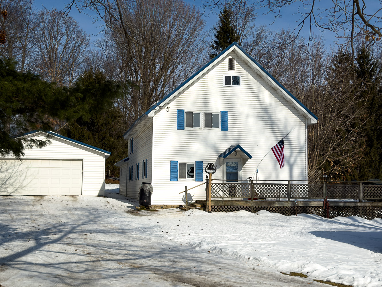The schoolhouse has been extensively modified during its transition to a residence, but the essential clues to its history remain. It is a wood-frame structure, now nicely sided with blue shutters and a blue metal roof, all in wonderful shape. An interior tour of the schoolhouse provided to me by the current owner shows the original roof timbers (see below), so the rectangular main part of the building is unchanged from its original size, though divided into a second story and several rooms. The single front door remains, with evidence for cloak rooms on either side. The west side of the house (4th photo below) has three normal home-sized windows, which mark the bottom of the tall windows which once lit-up the schoolhouse with sunlight. The front two windows on the east side (5th photo) have been replaced with a picture window. There is no remaining bell tower on the roof, but the bell mounted to the top of a post near the front door, though not original, is a nice decorative touch best shown in the 3rd photo below.