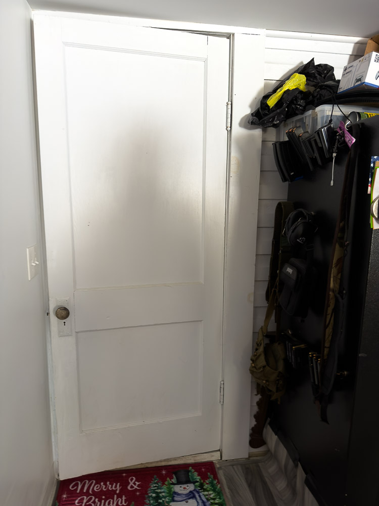 Inside the home, an original door from the schoolhouse has been preserved and is still in use (1st photo below), and the original clapboarding (right edge of 1st photo below) on the rear wall of the schoolhouse has been preserved on what is now an interior wall.