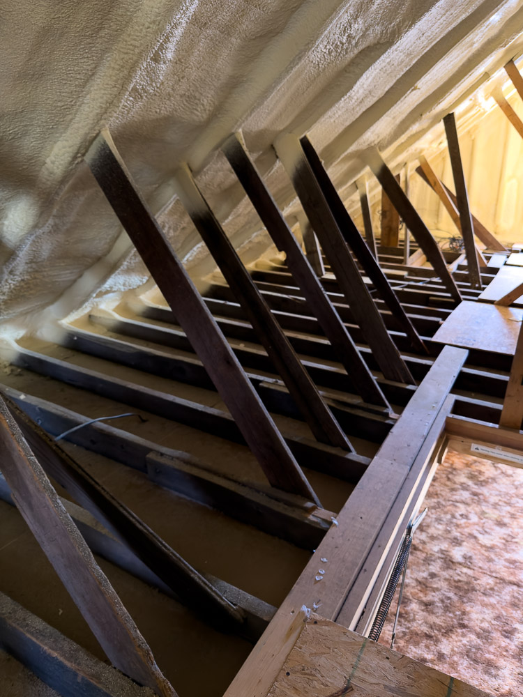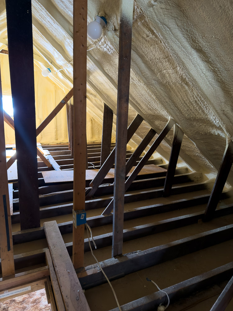 Original roof beams are visible in the views of the attic (3rd and 4th photos below). A root cellar still exists in the back yard (5th photo below), and original foundation fieldstones still support the schoolhouse (6th photo below).