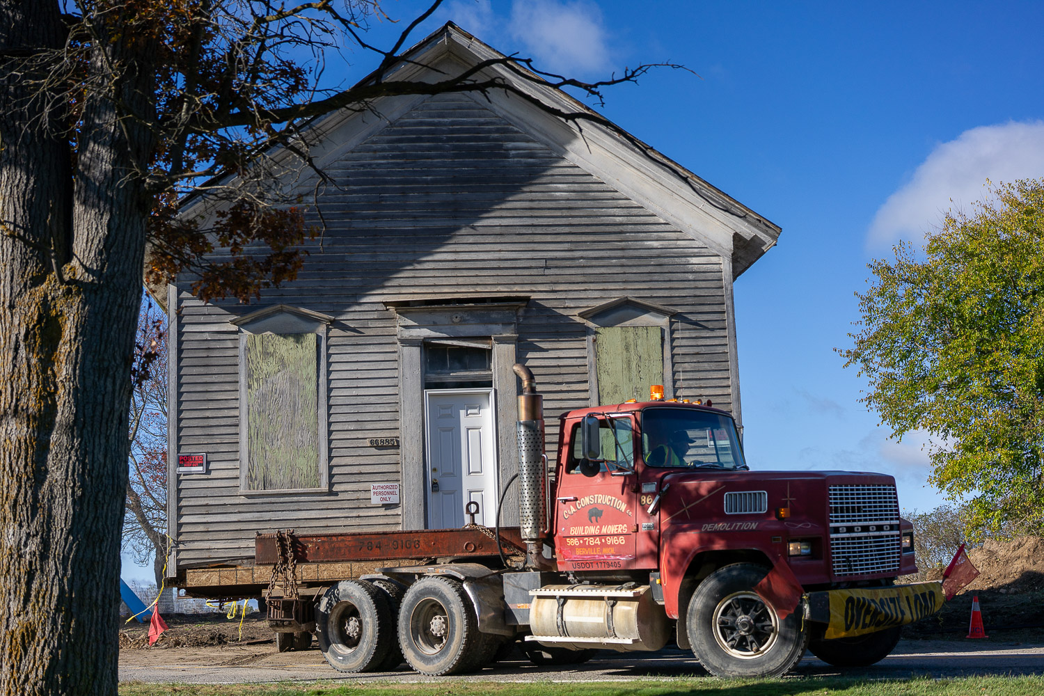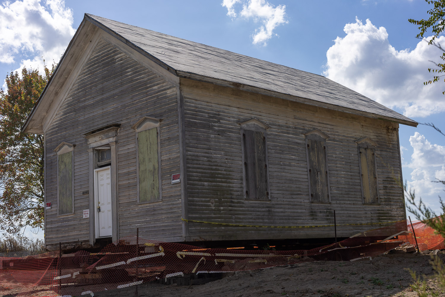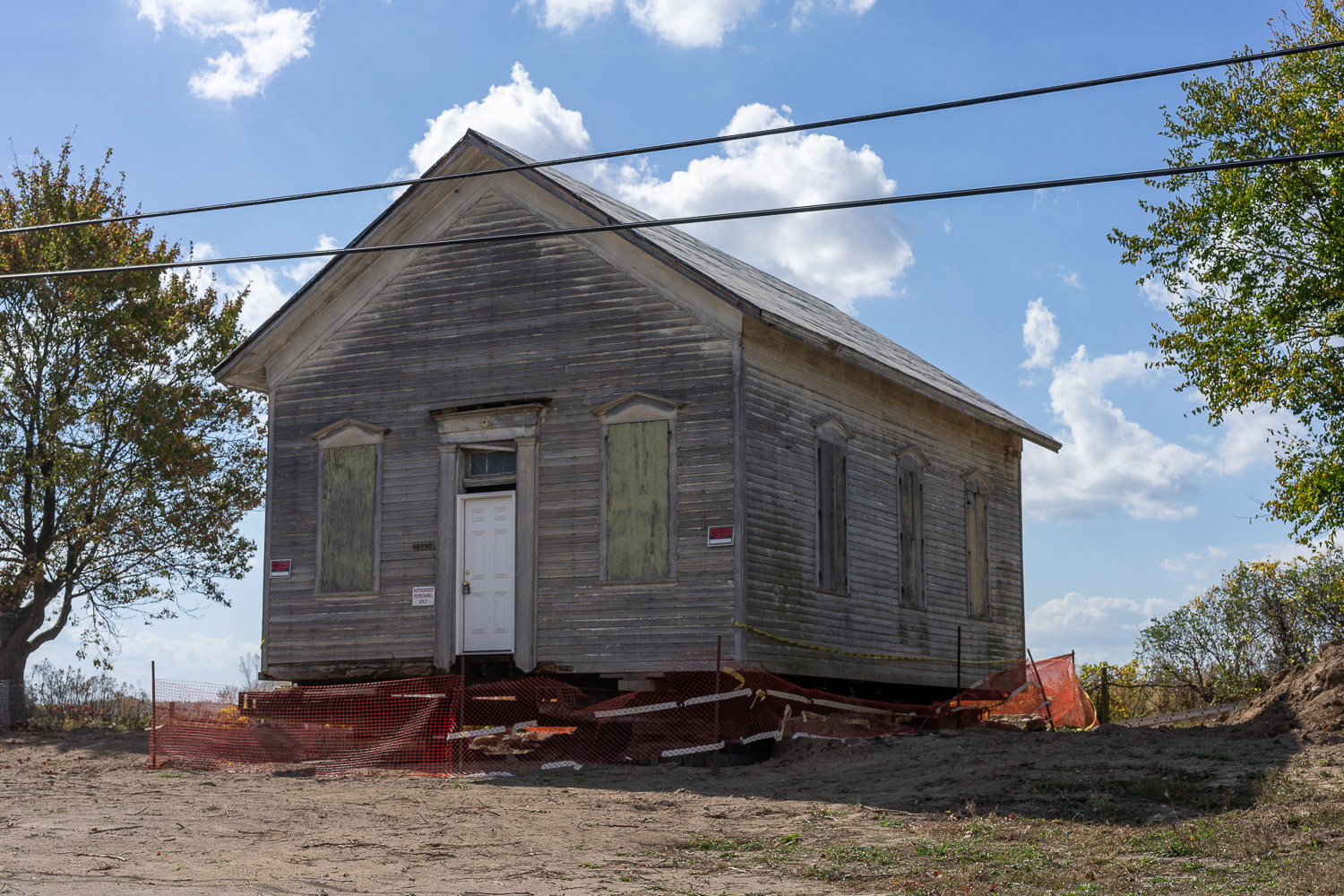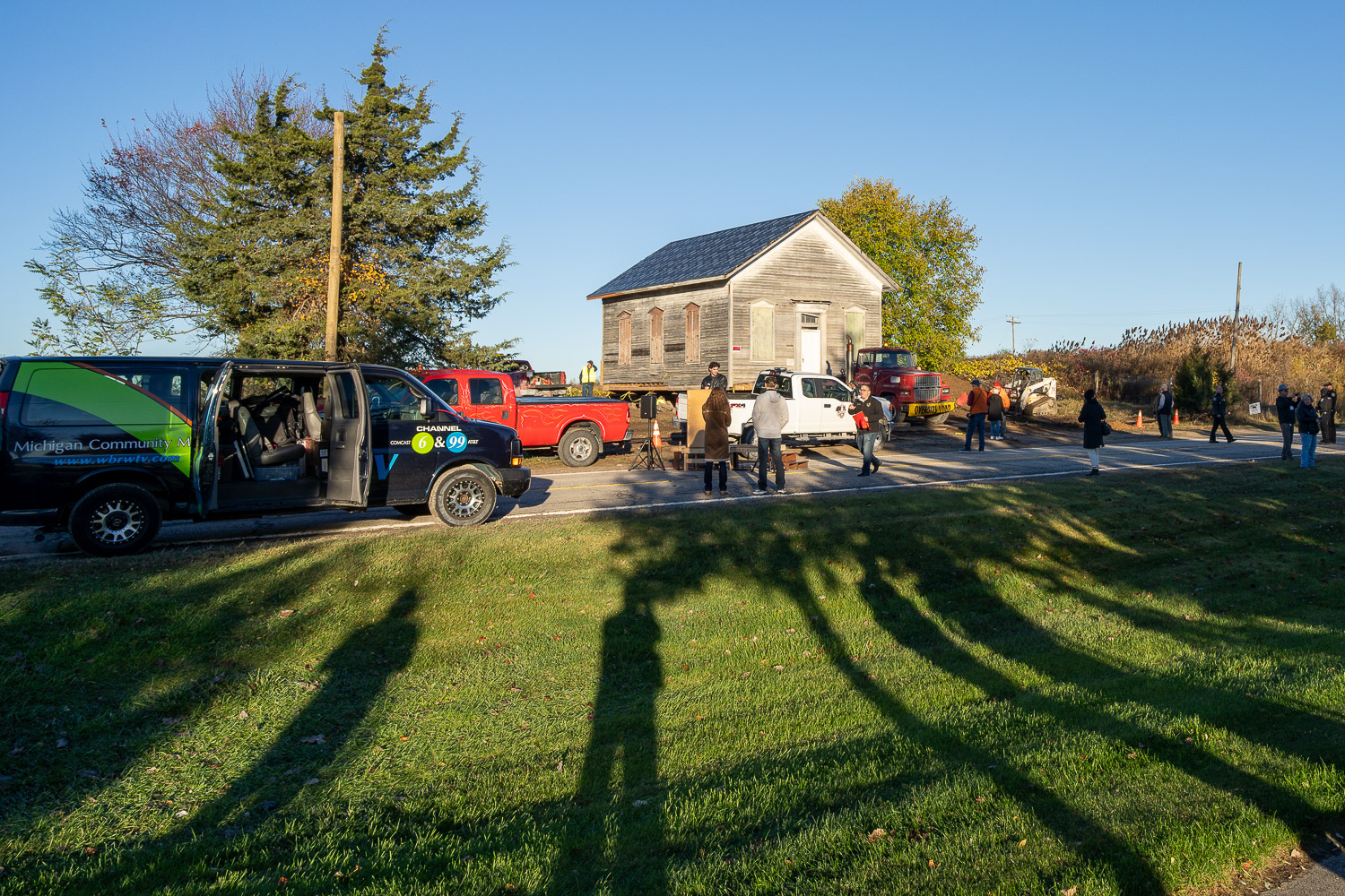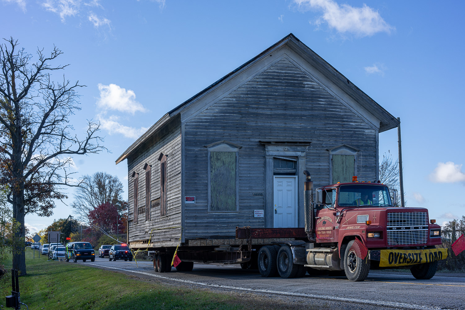 Location: Originally at 42.78505, -83.05854, on the west side of Mound Road, just south of 31 Mile Road, at 66885 Mound Rd, Washington, MI, moved 1/2 mile on October 24, 2025 to the new Thorington Park at 42.78504,-83.05202Thorington Schoolhouse was built before 1859, and was in use until the 1954-1955 school year. The school was annexed to Romeo Community Schools around 1955. It is a rectangular wood-frame schoolhouse. The schoolhouse was built to the standards of a Michigan one-room schoolhouse, with 3 large windows on each side to let in daylight sufficient for the students to easily see their work. A pot-bellied stove was in the center of the room to provide heat during the cold Michigan winters. A single centered door is in the front of the building, with a transom window above it to let light into the foyer, and a large window on either side. The windows have triangular pediments above them. The door has a simple flat pediment above it which is falling apart. The school was once considered worthy of some investment since it has a metal roof, but that roof has decayed to the point where it doesn't really protect the schoolhouse any more. There is a bell tower, without any school bell inside. No school identification sign exists any more. The back of the schoolhouse has no windows or doors. The school looks quite similar to Brownsville School No 1, near the southwest corner of Michigan; maybe they were built from the same plans? Some views of the interior of this schoolhouse, circa 2015-2016, are shown below: Gravel Pits now scrape the land behind the schoolhouse, as shown in this 2016 photograph behind the schoolhouse: The Thorington Settlement is the oldest settlement in Washington Township, Macomb County, Michigan. It is identified as the ghost town of Thoringtonville on Google Maps as of June 2021 but nothing is there except the schoolhouse, a few old farmhouses, and some new housing developments. James Thorington (born 1766, died Jan 17 1836) was the first settler to this area, arriving in 1819, 18 years before Michigan would become a state. He is buried in Brabb Cemetary, on 31 Mile Rd just east of Mound Road, very close to the schoolhouse, and his tombstone still stands, evidenced by the first photo below. The Brabb Cemetary, whose entrance is shown in the second photo below, honors another of the early prominent families in the neighborhood, and their house named the Brabb House on Van Dyke Avenue in Romeo, shown in the 3rd photo below, is the venue in which my wife and I were married. Thorington Schoolhouse on the Move, 2025 During 2025, Washington Township announced they have bought the Thorington Schoolhouse and will move it to a new park nearby on 31 Mile Rd and use high-school craftsmen students to restore it. This is a wonderful announcement, potentially saving this schoolhouse from the ravages of nature. They cleared away the vegetation near the schoolhouse in preparation for the move, and I took the two photos below of the cleared-away schoolhouse during April of 2025. As of July 30, 2025, the date of the move is still to be determined. Much work was done on the schoolhouse to prepare it for it's move. I visited on October 6, 2025, and the bell tower had been removed, the metal roof had been removed, the rafters and roof had been repaired/rebuilt, many rotting studs and boards had been replaced, the foundation had been removed, and the schoolhouse had been placed on a custom-made trailer for the move. Note in the first two photos below, taken from across the street, electrical wires are present which will be in the way of the move. In my photos at the top of the page, I had removed the wires in post-processing, or had taken the photo near enough to the schoolhouse to put the wires behind me. The move was scheduled for October 22, 2025, but rain delayed it until October 24th. Sunrise was at 7:57 AM, so shadows were still long when I arrived at the scene at 8:50 AM and took my first photo, the 1st photo below. A closer view from the same angle is in the 2nd photo below. Notice that the wires are down. Actually, they're temporarily buried and covered with plywood where the truck and schoolhouse will drive over them, as shown in the 3rd photo below. They'll be re-hung from the telephone poles after the move. The right side of the schoolhouse is shown in the 1st and 2nd photos below, and the ceremony/speeches before the schoolhouse move began in earnest is shown in the 3rd photo below. The guy talking, under the left-front window in that 3rd photo is Washington Township Supervisor, Sebastian Sam Previti. The final roadblocks to getting the move underway were the overhead electrical wires over Mound Road on the south side of 31 Mile Road, and the wires over 31 Mile Road on the east side of Mound Road. We all waited while DTE spent a long time moving those wires temporarily to allow the schoolhouse to pass. The 1st photo below shows DTE starting to lower the wires over Mound Road, the 2nd shows the wires down, and the 3rd and 4th photos show the boards which were put in place to cover the wires and prevent damage when the truck and schoolhouse drove over them. So that was enough to get the schoolhouse moving onto Mound Road, heading north, even if the wires around the corner on 31 Mile Road weren't yet out of the way. Approaching 31 Mile Road on Mound Road... They had to take it very slow and check in the 3rd photo below that they were safely crossing over the electric wires. After a short delay at the intersection, DTE had disconnected the wires crossing 31 Mile Road from one of the poles, and used two cherry-pickers to lift the line up higher than the top of the approaching schoolhouse. Once the turn onto 31 Mile Road was complete, I was down in the ditch and snapped a photo of the underside of the schoolhouse, and then one of the cigar-wielding driver of the truck. By then I had left my wife for 2 hours and I thought it was time to go back home, so I watched the schoolhou