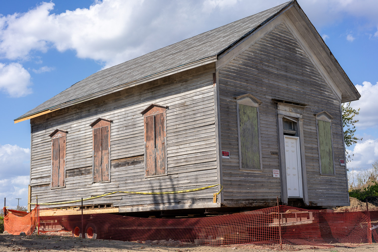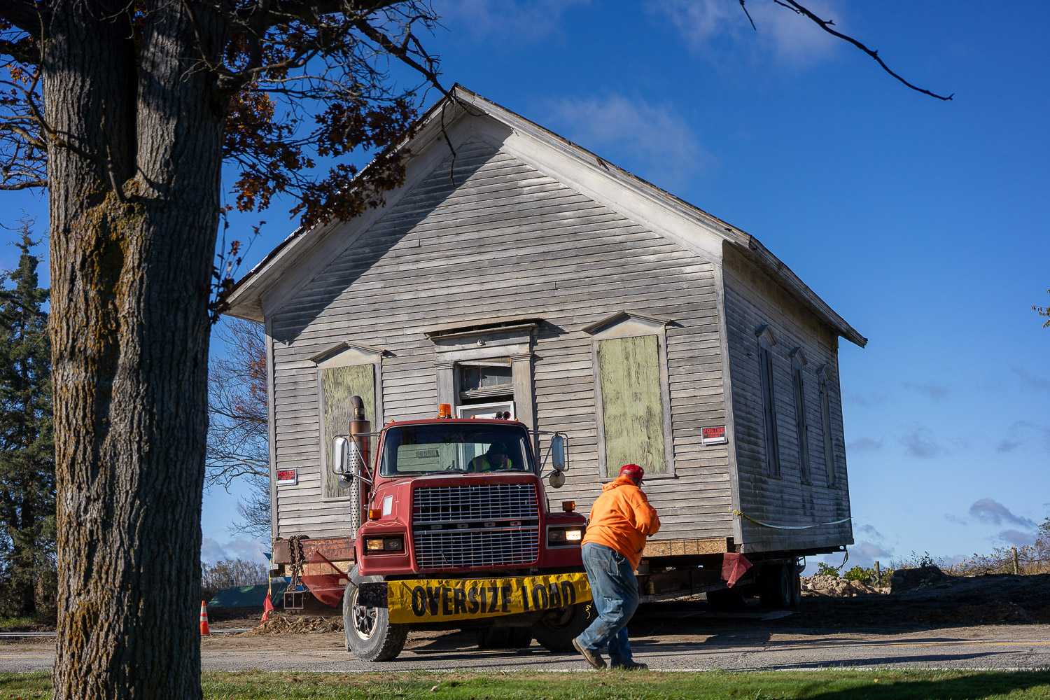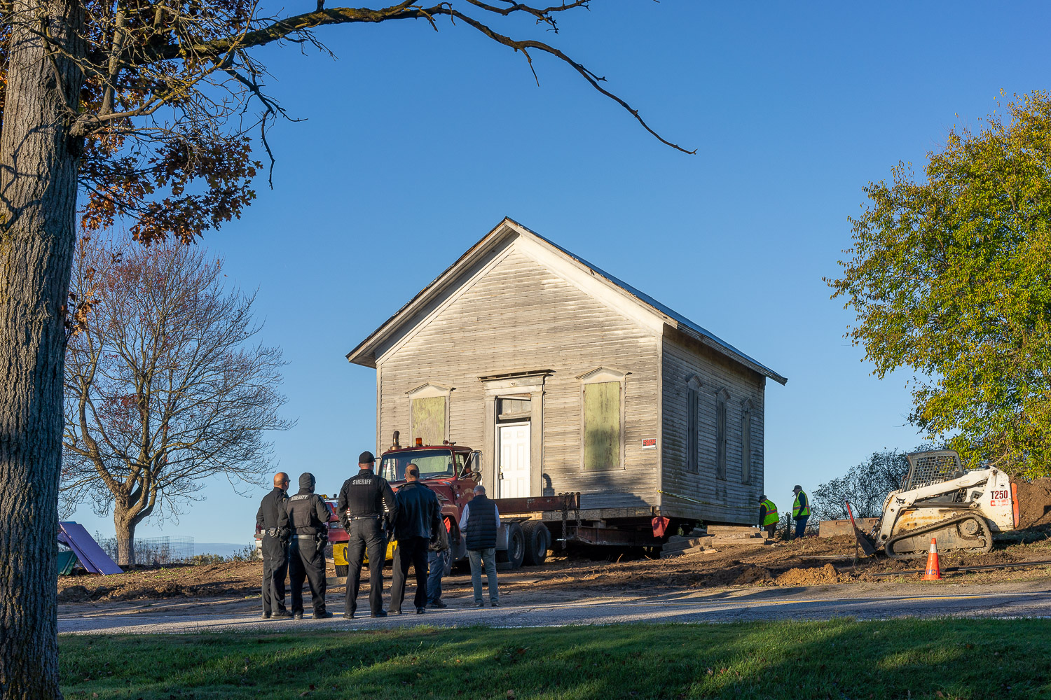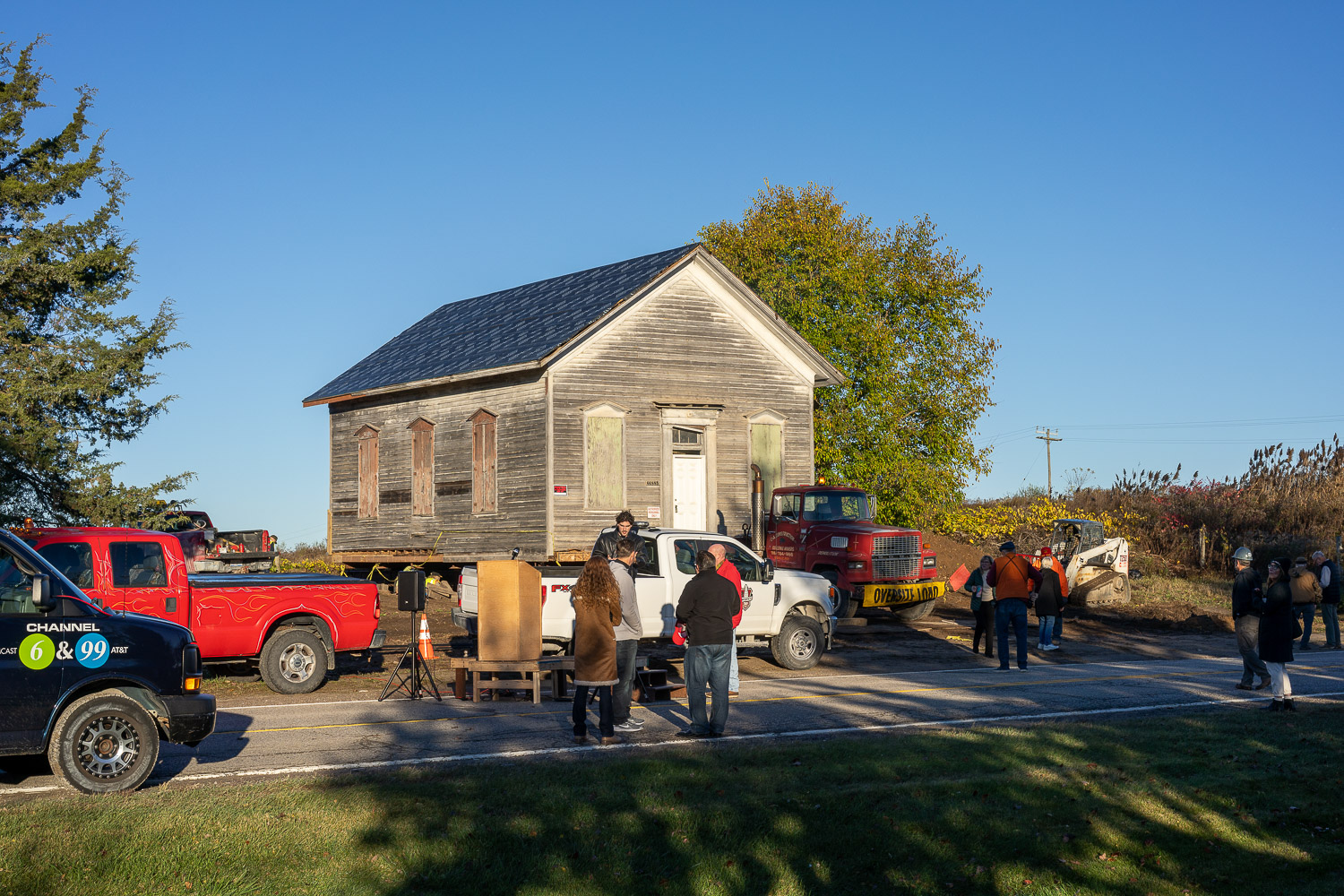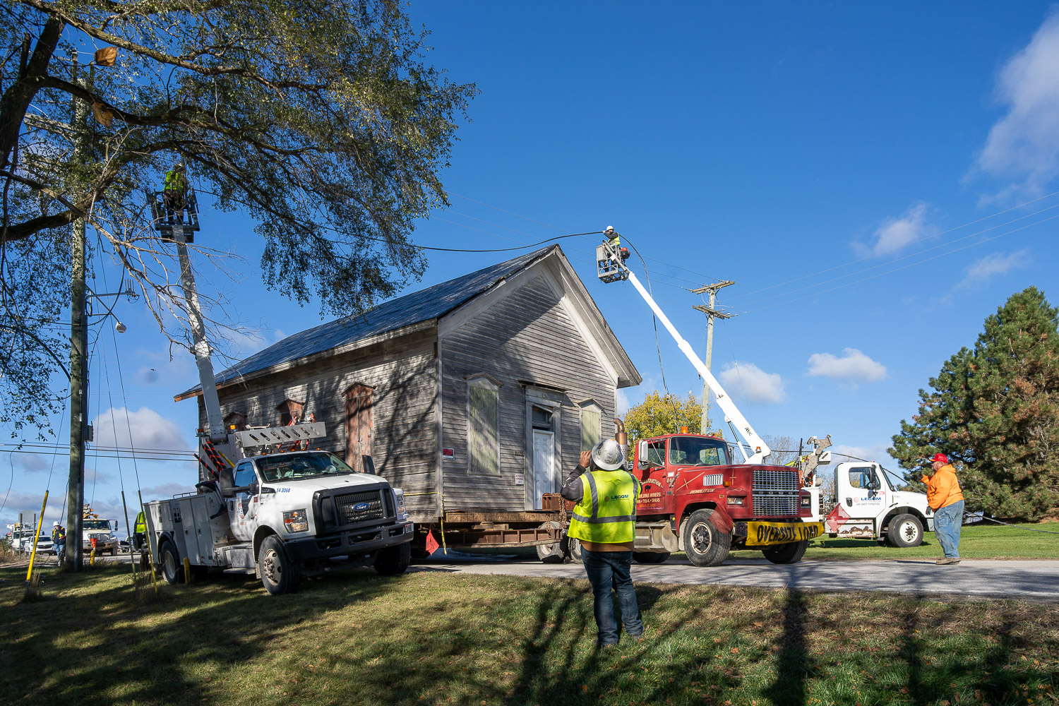 Location: Originally at 42.78505, -83.05854, on the west side of Mound Road, just south of 31 Mile Road, at 66885 Mound Rd, Washington, MI, moved 1/2 mile on October 24, 2025 to the new Thorington Park at 42.78504,-83.05202Thorington Schoolhouse was built before 1859, and was in use until the 1954-1955 school year. The school was annexed to Romeo Community Schools around 1955. It is a rectangular wood-frame schoolhouse. The schoolhouse was built to the standards of a Michigan one-room schoolhouse, with 3 large windows on each side to let in daylight sufficient for the students to easily see their work. A pot-bellied stove was in the center of the room to provide heat during the cold Michigan winters. A single centered door is in the front of the building, with a transom window above it to let light into the foyer, and a large window on either side. The windows have triangular pediments above them. The door has a simple flat pediment above it which is falling apart. The school was once considered worthy of some investment since it has a metal roof, but that roof has decayed to the point where it doesn't really protect the schoolhouse any more. There is a bell tower, without any school bell inside. No school identification sign exists any more. The back of the schoolhouse has no windows or doors. The school looks quite similar to Brownsville School No 1, near the southwest corner of Michigan; maybe they were built from the same plans? Some views of the interior of this schoolhouse, circa 2015-2016, are shown below: Gravel Pits now scrape the land behind the schoolhouse, as shown in this 2016 photograph behind the schoolhouse: The Thorington Settlement is the oldest settlement in Washington Township, Macomb County, Michigan. It is identified as the ghost town of Thoringtonville on Google Maps as of June 2021 but nothing is there except the schoolhouse, a few old farmhouses, and some new housing developments. James Thorington (born 1766, died Jan 17 1836) was the first settler to this area, arriving in 1819, 18 years before Michigan would become a state. He is buried in Brabb Cemetary, on 31 Mile Rd just east of Mound Road, very close to the schoolhouse, and his tombstone still stands, evidenced by the first photo below. The Brabb Cemetary, whose entrance is shown in the second photo below, honors another of the early prominent families in the neighborhood, and their house named the Brabb House on Van Dyke Avenue in Romeo, shown in the 3rd photo below, is the venue in which my wife and I were married. Thorington Schoolhouse on the Move, 2025 During 2025, Washington Township announced they have bought the Thorington Schoolhouse and will move it to a new park nearby on 31 Mile Rd and use high-school craftsmen students to restore it. This is a wonderful announcement, potentially saving this schoolhouse from the ravages of nature. They cleared away the vegetation near the schoolhouse in preparation for the move, and I took the two photos below of the cleared-away schoolhouse during April of 2025. As of July 30, 2025, the date of the move is still to be determined. Much work was done on the schoolhouse to prepare it for it's move. I visited on October 6, 2025, and the bell tower had been removed, the metal roof had been removed, the rafters and roof had been repaired/rebuilt, many rotting studs and boards had been replaced, the foundation had been removed, and the schoolhouse had been placed on a custom-made trailer for the move. Note in the first two photos below, taken from across the street, electrical wires are present which will be in the way of the move. In my photos at the top of the page, I had removed the wires in post-processing, or had taken the photo near enough to the schoolhouse to put the wires behind me. The move was scheduled for October 22, 2025, but rain delayed it until October 24th. Sunrise was at 7:57 AM, so shadows were still long when I arrived at the scene at 8:50 AM and took my first photo, the 1st photo below. A closer view from the same angle is in the 2nd photo below. Notice that the wires are down. Actually, they're temporarily buried and covered with plywood where the truck and schoolhouse will drive over them, as shown in the 3rd photo below. They'll be re-hung from the telephone poles after the move. The right side of the schoolhouse is shown in the 1st and 2nd photos below, and the ceremony/speeches before the schoolhouse move began in earnest is shown in the 3rd photo below. The guy talking, under the left-front window in that 3rd photo is Washington Township Supervisor, Sebastian Sam Previti. The final roadblocks to getting the move underway were the overhead electrical wires over Mound Road on the south side of 31 Mile Road, and the wires over 31 Mile Road on the east side of Mound Road. We all waited while DTE spent a long time moving those wires temporarily to allow the schoolhouse to pass. The 1st photo below shows DTE starting to lower the wires over Mound Road, the 2nd shows the wires down, and the 3rd and 4th photos show the boards which were put in place to cover the wires and prevent damage when the truck and schoolhouse drove over them. So that was enough to get the schoolhouse moving onto Mound Road, heading north, even if the wires around the corner on 31 Mile Road weren't yet out of the way. Approaching 31 Mile Road on Mound Road... They had to take it very slow and check in the 3rd photo below that they were safely crossing over the electric wires. After a short delay at the intersection, DTE had disconnected the wires crossing 31 Mile Road from one of the poles, and used two cherry-pickers to lift the line up higher than the top of the approaching schoolhouse. Once the turn onto 31 Mile Road was complete, I was down in the ditch and snapped a photo of the underside of the schoolhouse, and then one of the cigar-wielding driver of the truck. By then I had left my wife for 2 hours and I thought it was time to go back home, so I watched the schoolhou