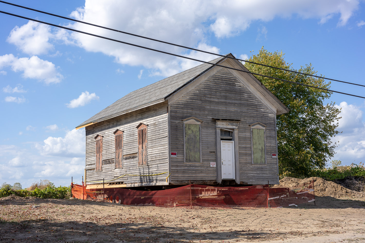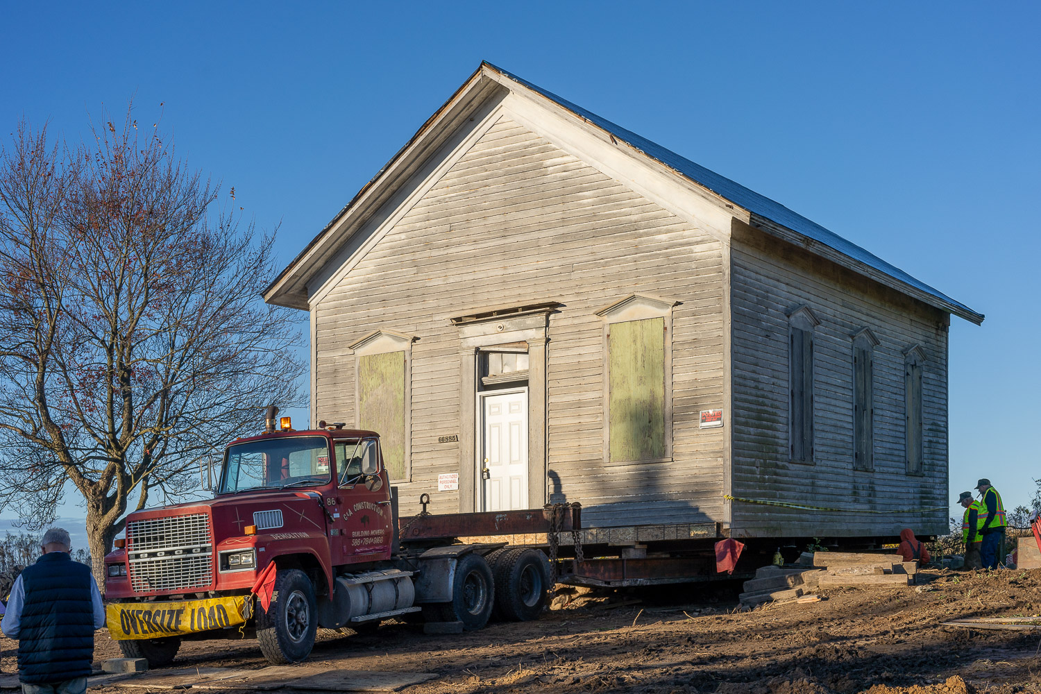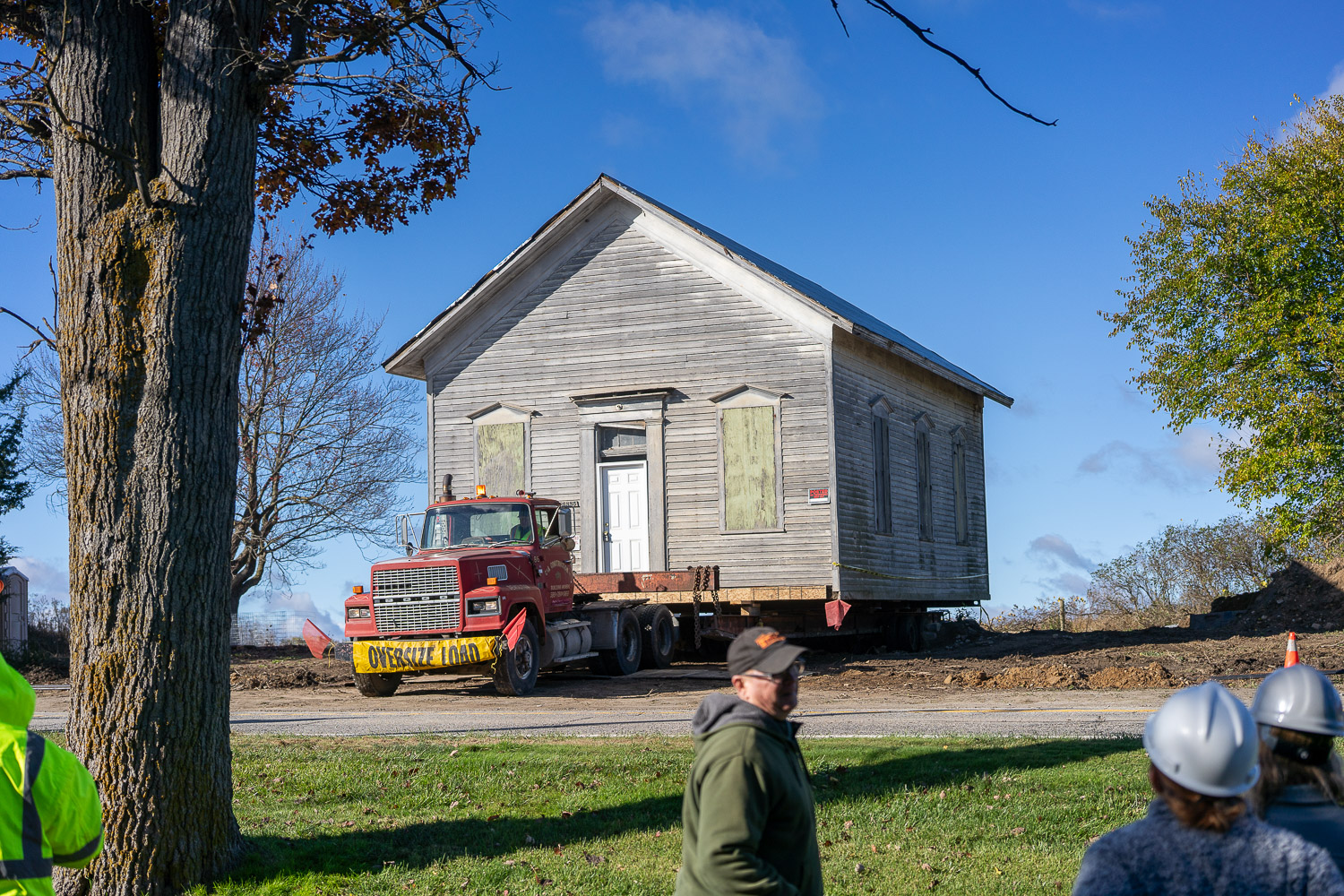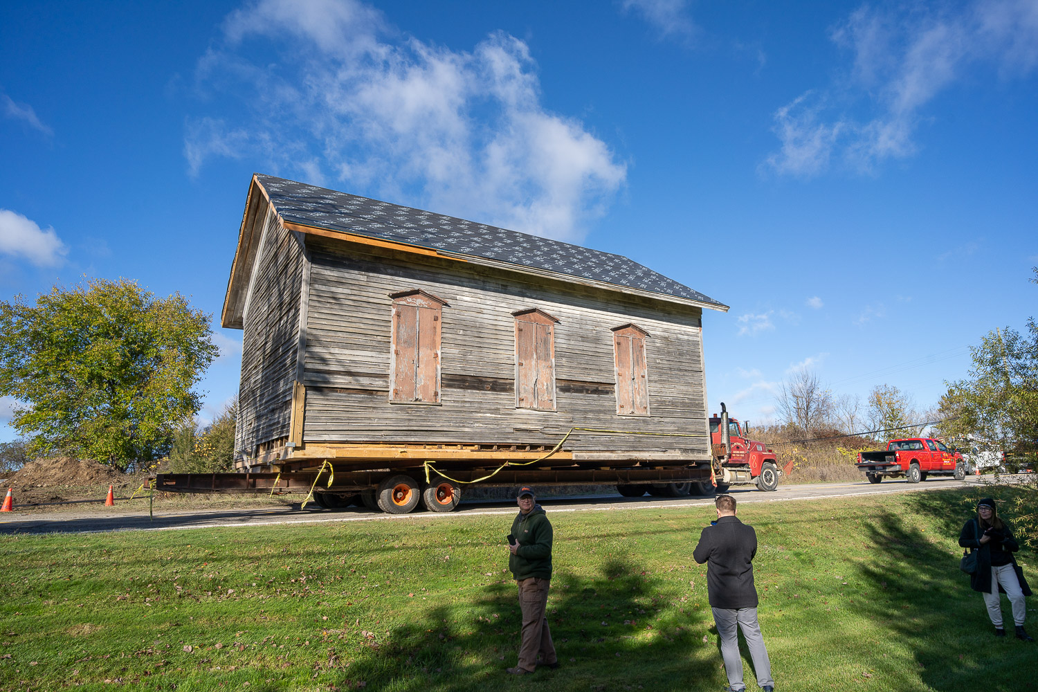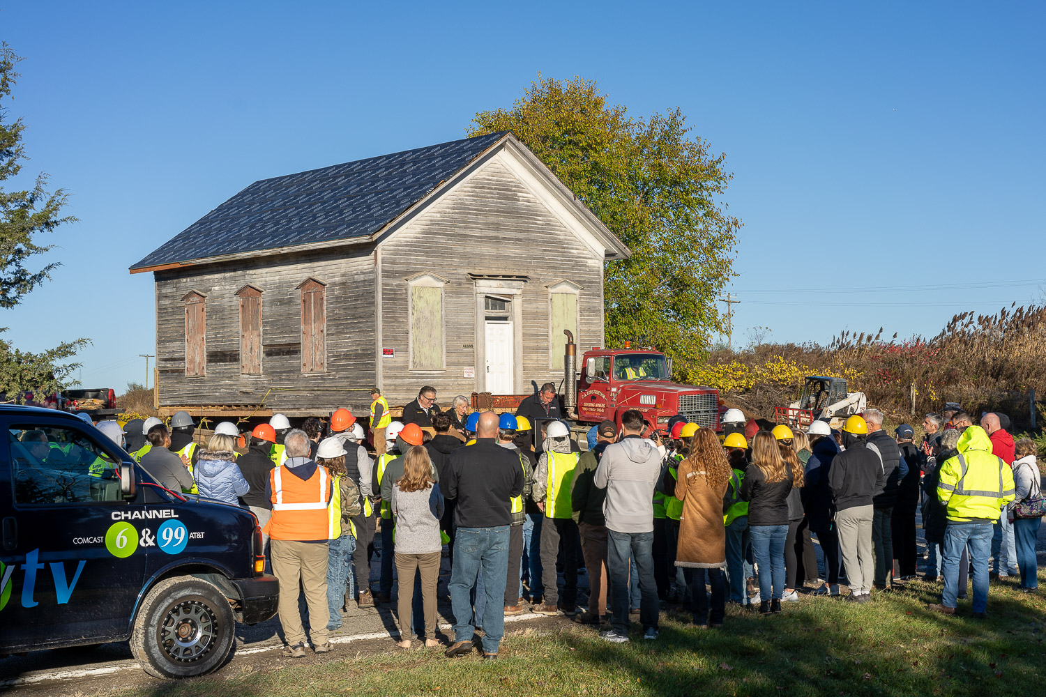 Location: Originally at 42.78505, -83.05854, on the west side of Mound Road, just south of 31 Mile Road, at 66885 Mound Rd, Washington, MI, moved 1/2 mile on October 24, 2025 to the new Thorington Park at 42.78504,-83.05202Thorington Schoolhouse was built before 1859, and was in use until the 1954-1955 school year. The school was annexed to Romeo Community Schools around 1955. It is a rectangular wood-frame schoolhouse. The schoolhouse was built to the standards of a Michigan one-room schoolhouse, with 3 large windows on each side to let in daylight sufficient for the students to easily see their work. A pot-bellied stove was in the center of the room to provide heat during the cold Michigan winters. A single centered door is in the front of the building, with a transom window above it to let light into the foyer, and a large window on either side. The windows have triangular pediments above them. The door has a simple flat pediment above it which is falling apart. The school was once considered worthy of some investment since it has a metal roof, but that roof has decayed to the point where it doesn't really protect the schoolhouse any more. There is a bell tower, without any school bell inside. No school identification sign exists any more. The back of the schoolhouse has no windows or doors. The school looks quite similar to Brownsville School No 1, near the southwest corner of Michigan; maybe they were built from the same plans? Some views of the interior of this schoolhouse, circa 2015-2016, are shown below: Gravel Pits now scrape the land behind the schoolhouse, as shown in this 2016 photograph behind the schoolhouse: The Thorington Settlement is the oldest settlement in Washington Township, Macomb County, Michigan. It is identified as the ghost town of Thoringtonville on Google Maps as of June 2021 but nothing is there except the schoolhouse, a few old farmhouses, and some new housing developments. James Thorington (born 1766, died Jan 17 1836) was the first settler to this area, arriving in 1819, 18 years before Michigan would become a state. He is buried in Brabb Cemetary, on 31 Mile Rd just east of Mound Road, very close to the schoolhouse, and his tombstone still stands, evidenced by the first photo below. The Brabb Cemetary, whose entrance is shown in the second photo below, honors another of the early prominent families in the neighborhood, and their house named the Brabb House on Van Dyke Avenue in Romeo, shown in the 3rd photo below, is the venue in which my wife and I were married. Thorington Schoolhouse on the Move, 2025 During 2025, Washington Township announced they have bought the Thorington Schoolhouse and will move it to a new park nearby on 31 Mile Rd and use high-school craftsmen students to restore it. This is a wonderful announcement, potentially saving this schoolhouse from the ravages of nature. They cleared away the vegetation near the schoolhouse in preparation for the move, and I took the two photos below of the cleared-away schoolhouse during April of 2025. As of July 30, 2025, the date of the move is still to be determined. Much work was done on the schoolhouse to prepare it for it's move. I visited on October 6, 2025, and the bell tower had been removed, the metal roof had been removed, the rafters and roof had been repaired/rebuilt, many rotting studs and boards had been replaced, the foundation had been removed, and the schoolhouse had been placed on a custom-made trailer for the move. Note in the first two photos below, taken from across the street, electrical wires are present which will be in the way of the move. In my photos at the top of the page, I had removed the wires in post-processing, or had taken the photo near enough to the schoolhouse to put the wires behind me. The move was scheduled for October 22, 2025, but rain delayed it until October 24th. Sunrise was at 7:57 AM, so shadows were still long when I arrived at the scene at 8:50 AM and took my first photo, the 1st photo below. A closer view from the same angle is in the 2nd photo below. Notice that the wires are down. Actually, they're temporarily buried and covered with plywood where the truck and schoolhouse will drive over them, as shown in the 3rd photo below. They'll be re-hung from the telephone poles after the move. The right side of the schoolhouse is shown in the 1st and 2nd photos below, and the ceremony/speeches before the schoolhouse move began in earnest is shown in the 3rd photo below. The guy talking, under the left-front window in that 3rd photo is Washington Township Supervisor, Sebastian Sam Previti. The final roadblocks to getting the move underway were the overhead electrical wires over Mound Road on the south side of 31 Mile Road, and the wires over 31 Mile Road on the east side of Mound Road. We all waited while DTE spent a long time moving those wires temporarily to allow the schoolhouse to pass. The 1st photo below shows DTE starting to lower the wires over Mound Road, the 2nd shows the wires down, and the 3rd and 4th photos show the boards which were put in place to cover the wires and prevent damage when the truck and schoolhouse drove over them. So that was enough to get the schoolhouse moving onto Mound Road, heading north, even if the wires around the corner on 31 Mile Road weren't yet out of the way. Approaching 31 Mile Road on Mound Road... They had to take it very slow and check in the 3rd photo below that they were safely crossing over the electric wires. After a short delay at the intersection, DTE had disconnected the wires crossing 31 Mile Road from one of the poles, and used two cherry-pickers to lift the line up higher than the top of the approaching schoolhouse. Once the turn onto 31 Mile Road was complete, I was down in the ditch and snapped a photo of the underside of the schoolhouse, and then one of the cigar-wielding driver of the truck. By then I had left my wife for 2 hours and I thought it was time to go back home, so I watched the schoolhou