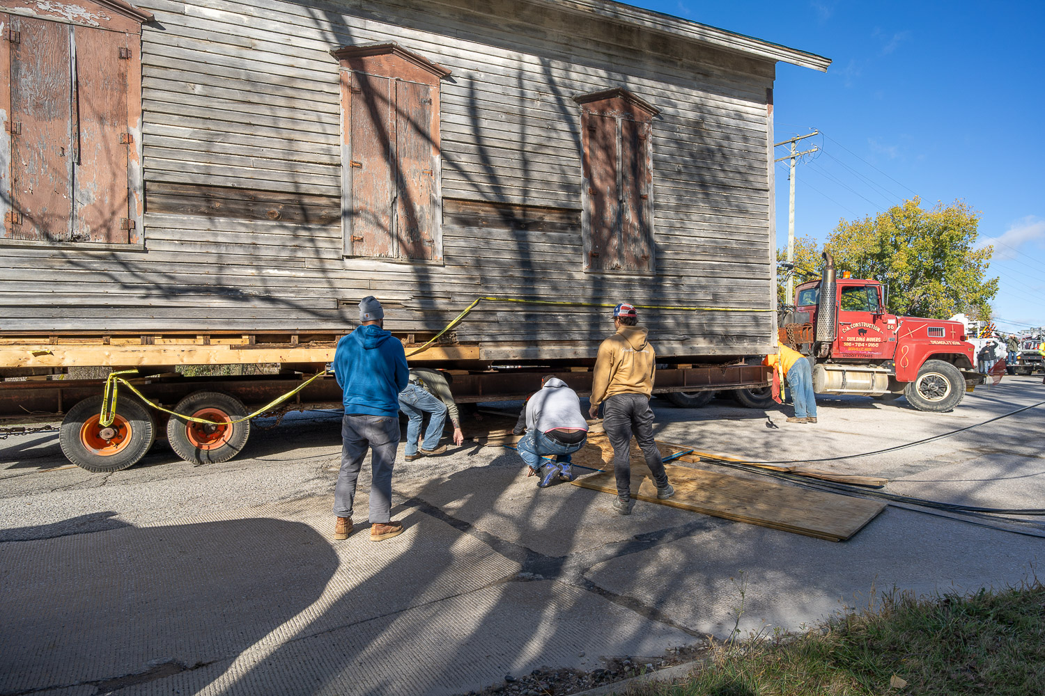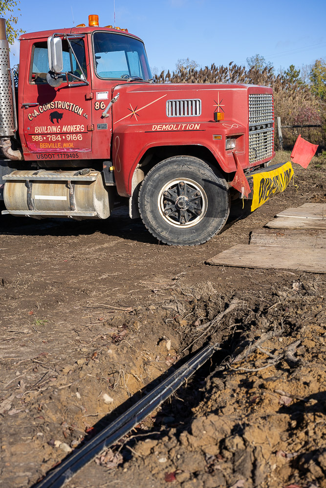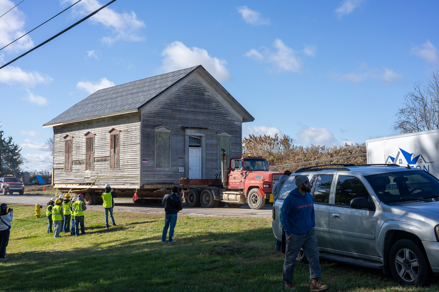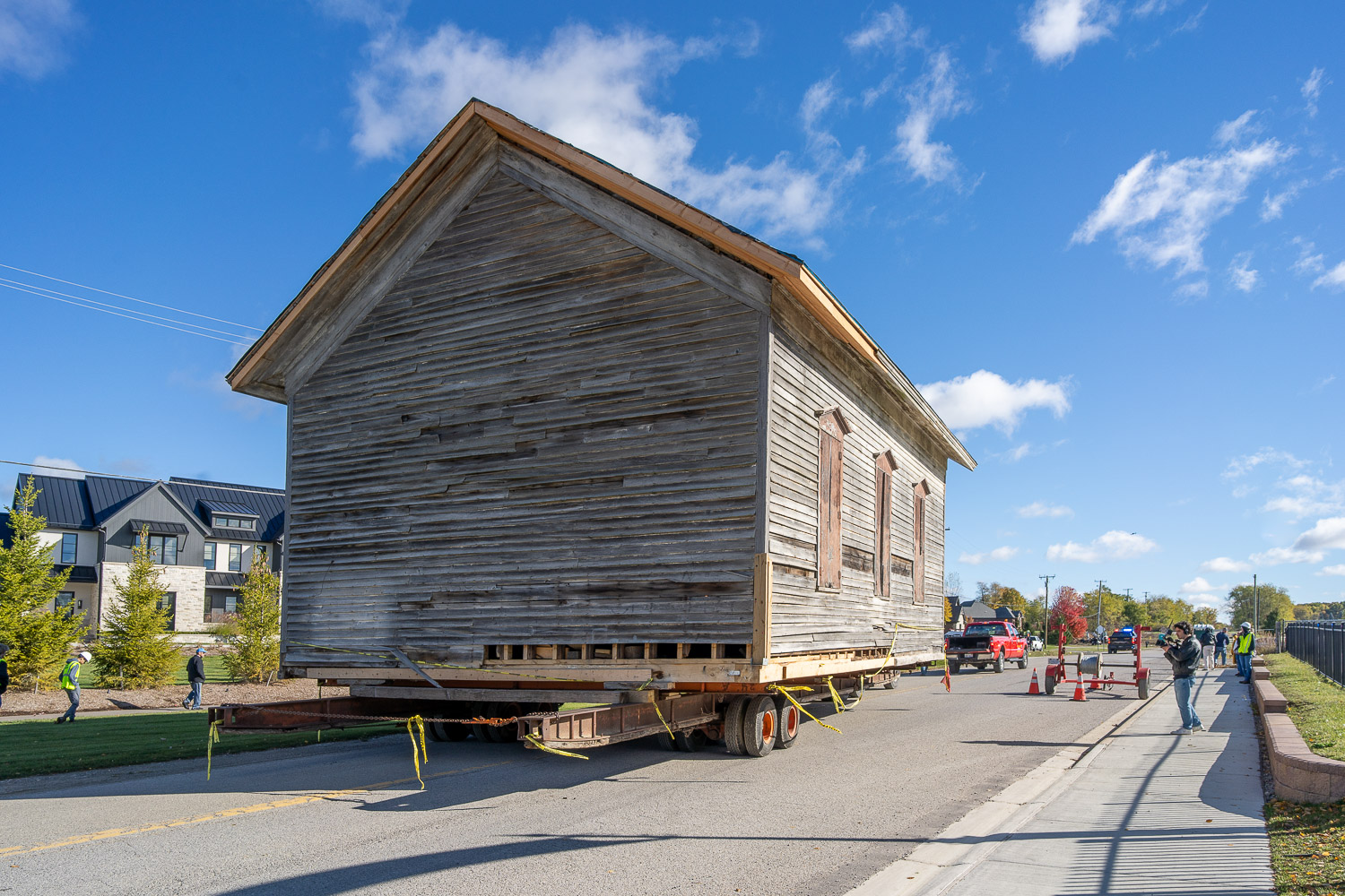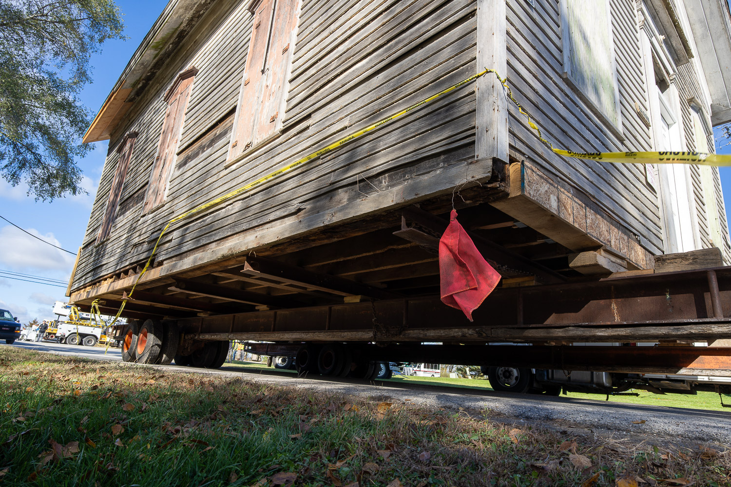 Location: Originally at 42.78505, -83.05854, on the west side of Mound Road, just south of 31 Mile Road, at 66885 Mound Rd, Washington, MI, moved 1/2 mile on October 24, 2025 to the new Thorington Park at 42.78504,-83.05202Thorington Schoolhouse was built before 1859, and was in use until the 1954-1955 school year. The school was annexed to Romeo Community Schools around 1955. It is a rectangular wood-frame schoolhouse. The schoolhouse was built to the standards of a Michigan one-room schoolhouse, with 3 large windows on each side to let in daylight sufficient for the students to easily see their work. A pot-bellied stove was in the center of the room to provide heat during the cold Michigan winters. A single centered door is in the front of the building, with a transom window above it to let light into the foyer, and a large window on either side. The windows have triangular pediments above them. The door has a simple flat pediment above it which is falling apart. The school was once considered worthy of some investment since it has a metal roof, but that roof has decayed to the point where it doesn't really protect the schoolhouse any more. There is a bell tower, without any school bell inside. No school identification sign exists any more. The back of the schoolhouse has no windows or doors. The school looks quite similar to Brownsville School No 1, near the southwest corner of Michigan; maybe they were built from the same plans? Some views of the interior of this schoolhouse, circa 2015-2016, are shown below: Gravel Pits now scrape the land behind the schoolhouse, as shown in this 2016 photograph behind the schoolhouse: The Thorington Settlement is the oldest settlement in Washington Township, Macomb County, Michigan. It is identified as the ghost town of Thoringtonville on Google Maps as of June 2021 but nothing is there except the schoolhouse, a few old farmhouses, and some new housing developments. James Thorington (born 1766, died Jan 17 1836) was the first settler to this area, arriving in 1819, 18 years before Michigan would become a state. He is buried in Brabb Cemetary, on 31 Mile Rd just east of Mound Road, very close to the schoolhouse, and his tombstone still stands, evidenced by the first photo below. The Brabb Cemetary, whose entrance is shown in the second photo below, honors another of the early prominent families in the neighborhood, and their house named the Brabb House on Van Dyke Avenue in Romeo, shown in the 3rd photo below, is the venue in which my wife and I were married. Thorington Schoolhouse on the Move, 2025 During 2025, Washington Township announced they have bought the Thorington Schoolhouse and will move it to a new park nearby on 31 Mile Rd and use high-school craftsmen students to restore it. This is a wonderful announcement, potentially saving this schoolhouse from the ravages of nature. They cleared away the vegetation near the schoolhouse in preparation for the move, and I took the two photos below of the cleared-away schoolhouse during April of 2025. As of July 30, 2025, the date of the move is still to be determined. Much work was done on the schoolhouse to prepare it for it's move. I visited on October 6, 2025, and the bell tower had been removed, the metal roof had been removed, the rafters and roof had been repaired/rebuilt, many rotting studs and boards had been replaced, the foundation had been removed, and the schoolhouse had been placed on a custom-made trailer for the move. Note in the first two photos below, taken from across the street, electrical wires are present which will be in the way of the move. In my photos at the top of the page, I had removed the wires in post-processing, or had taken the photo near enough to the schoolhouse to put the wires behind me. The move was scheduled for October 22, 2025, but rain delayed it until October 24th. Sunrise was at 7:57 AM, so shadows were still long when I arrived at the scene at 8:50 AM and took my first photo, the 1st photo below. A closer view from the same angle is in the 2nd photo below. Notice that the wires are down. Actually, they're temporarily buried and covered with plywood where the truck and schoolhouse will drive over them, as shown in the 3rd photo below. They'll be re-hung from the telephone poles after the move. The right side of the schoolhouse is shown in the 1st and 2nd photos below, and the ceremony/speeches before the schoolhouse move began in earnest is shown in the 3rd photo below. The guy talking, under the left-front window in that 3rd photo is Washington Township Supervisor, Sebastian Sam Previti. The final roadblocks to getting the move underway were the overhead electrical wires over Mound Road on the south side of 31 Mile Road, and the wires over 31 Mile Road on the east side of Mound Road. We all waited while DTE spent a long time moving those wires temporarily to allow the schoolhouse to pass. The 1st photo below shows DTE starting to lower the wires over Mound Road, the 2nd shows the wires down, and the 3rd and 4th photos show the boards which were put in place to cover the wires and prevent damage when the truck and schoolhouse drove over them. So that was enough to get the schoolhouse moving onto Mound Road, heading north, even if the wires around the corner on 31 Mile Road weren't yet out of the way. Approaching 31 Mile Road on Mound Road... They had to take it very slow and check in the 3rd photo below that they were safely crossing over the electric wires. After a short delay at the intersection, DTE had disconnected the wires crossing 31 Mile Road from one of the poles, and used two cherry-pickers to lift the line up higher than the top of the approaching schoolhouse. Once the turn onto 31 Mile Road was complete, I was down in the ditch and snapped a photo of the underside of the schoolhouse, and then one of the cigar-wielding driver of the truck. By then I had left my wife for 2 hours and I thought it was time to go back home, so I watched the schoolhou