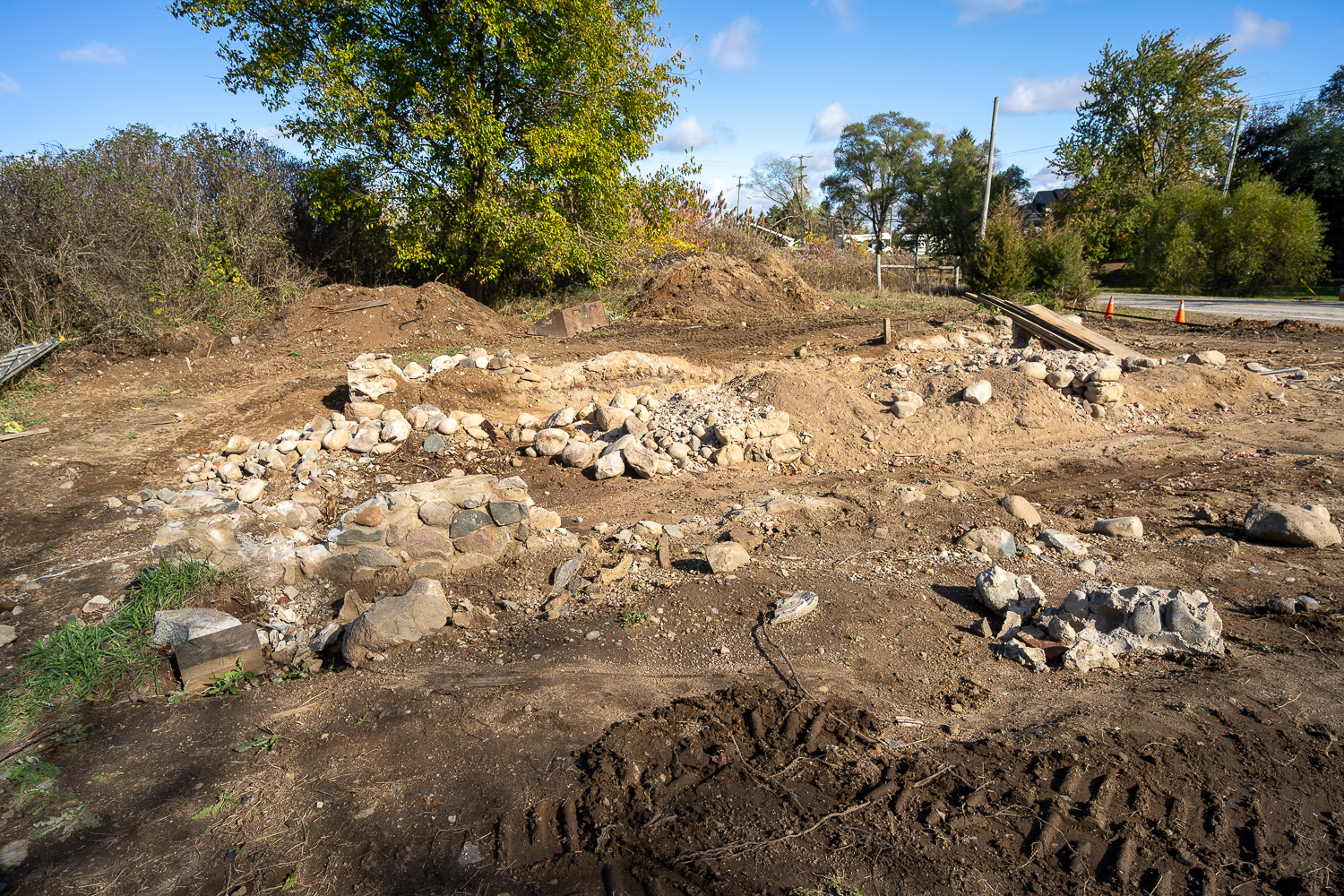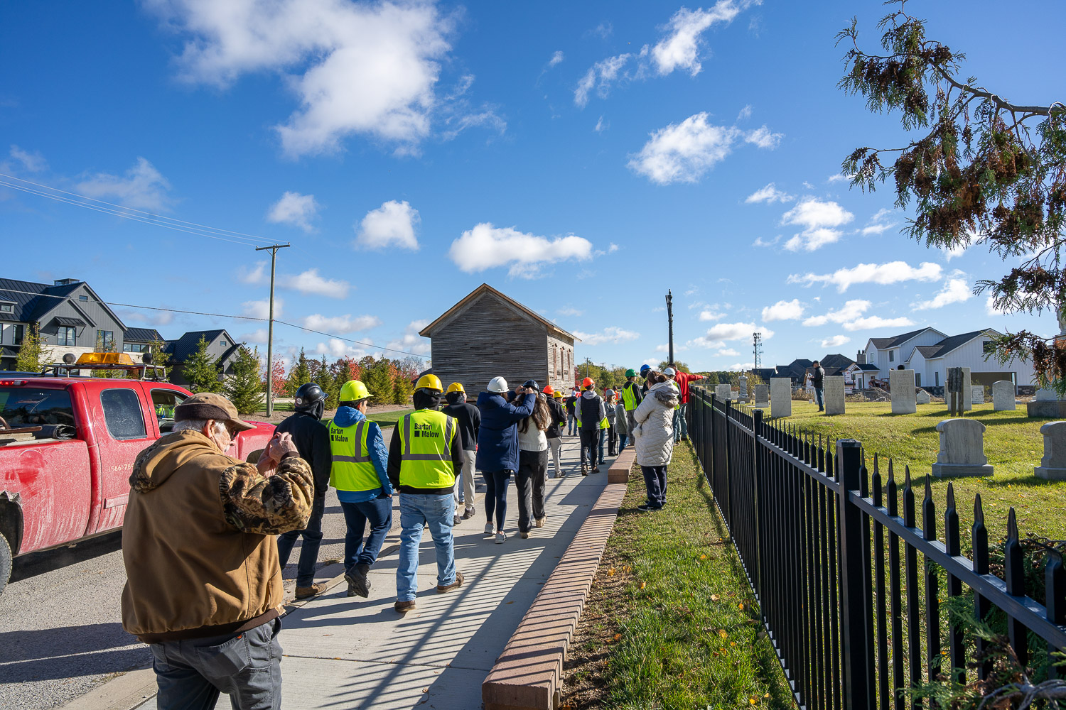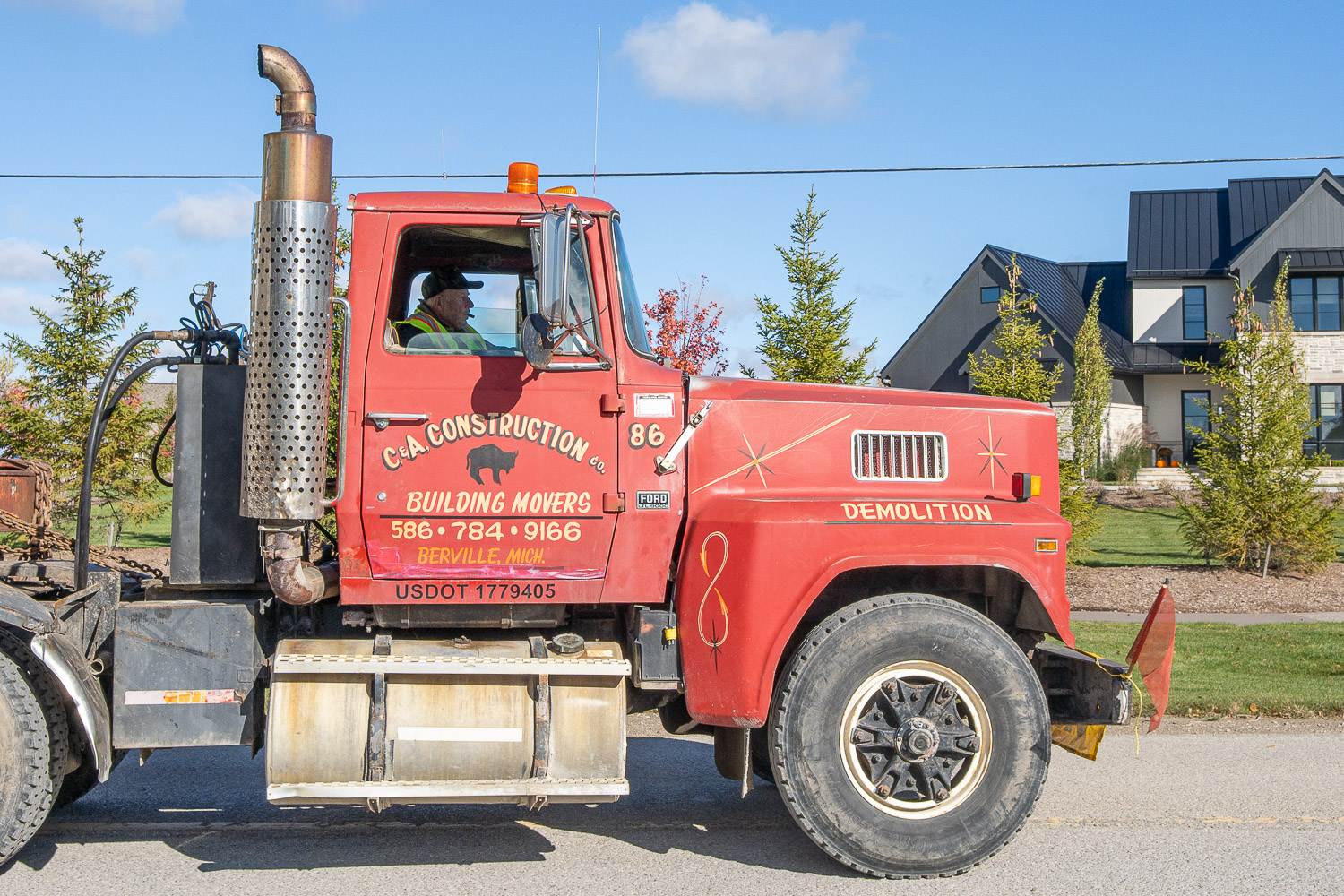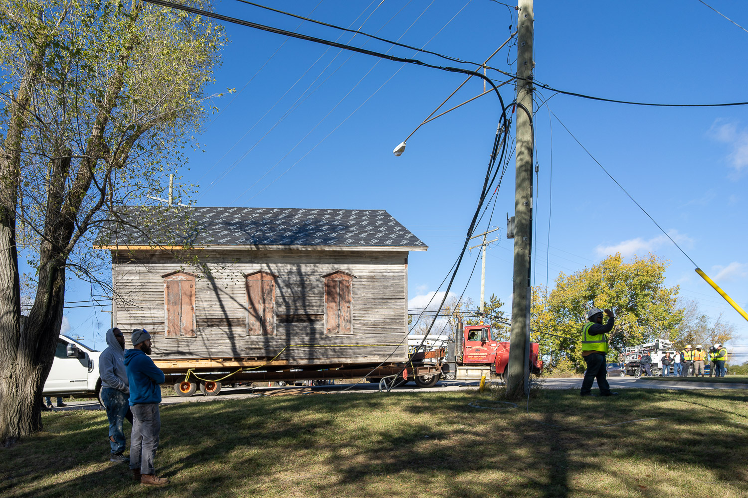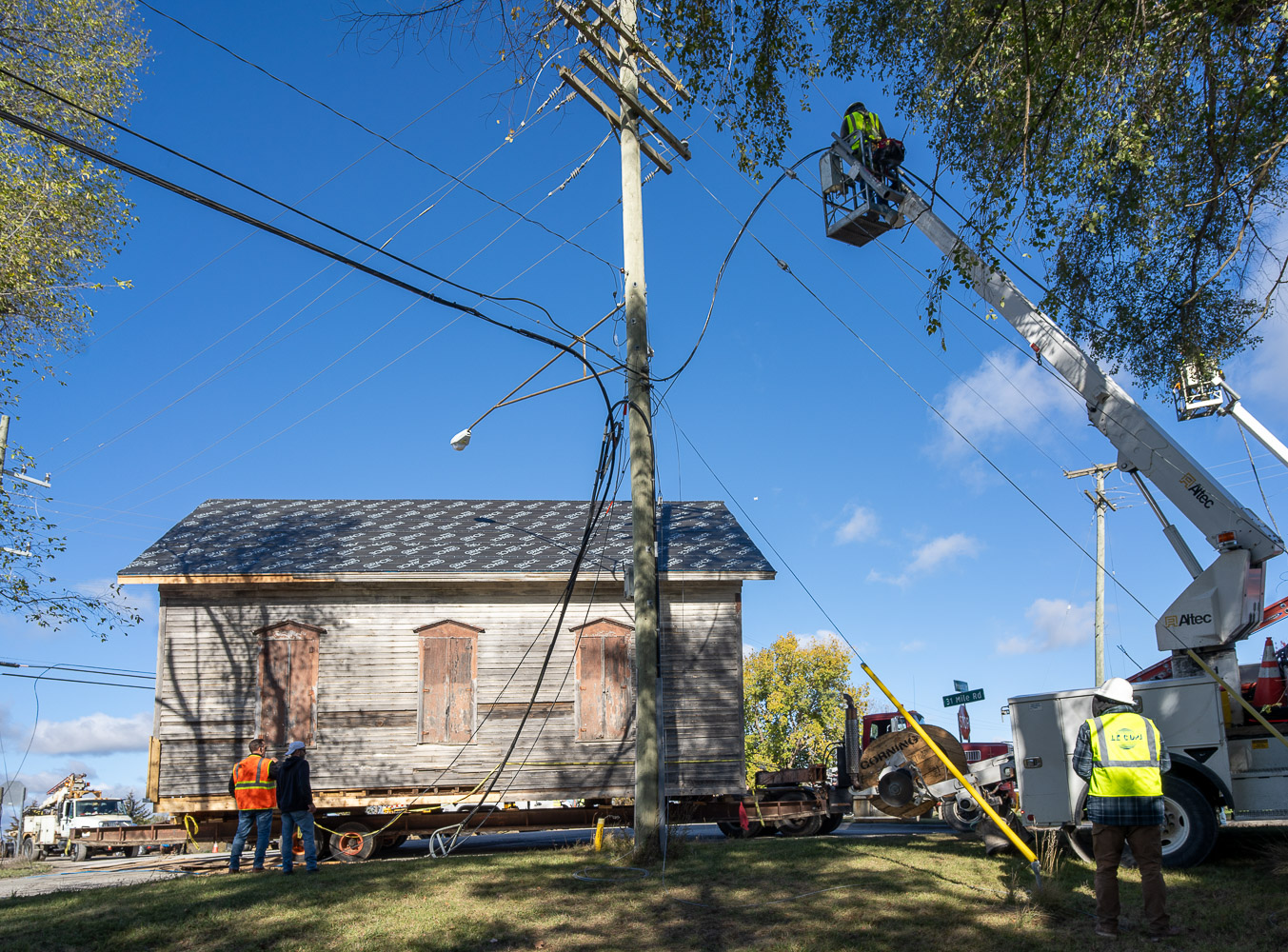 Location: Originally at 42.78505, -83.05854, on the west side of Mound Road, just south of 31 Mile Road, at 66885 Mound Rd, Washington, MI, moved 1/2 mile on October 24, 2025 to the new Thorington Park at 42.78504,-83.05202Thorington Schoolhouse was built before 1859, and was in use until the 1954-1955 school year. The school was annexed to Romeo Community Schools around 1955. It is a rectangular wood-frame schoolhouse. The schoolhouse was built to the standards of a Michigan one-room schoolhouse, with 3 large windows on each side to let in daylight sufficient for the students to easily see their work. A pot-bellied stove was in the center of the room to provide heat during the cold Michigan winters. A single centered door is in the front of the building, with a transom window above it to let light into the foyer, and a large window on either side. The windows have triangular pediments above them. The door has a simple flat pediment above it which is falling apart. The school was once considered worthy of some investment since it has a metal roof, but that roof has decayed to the point where it doesn't really protect the schoolhouse any more. There is a bell tower, without any school bell inside. No school identification sign exists any more. The back of the schoolhouse has no windows or doors. The school looks quite similar to Brownsville School No 1, near the southwest corner of Michigan; maybe they were built from the same plans? Some views of the interior of this schoolhouse, circa 2015-2016, are shown below: Gravel Pits now scrape the land behind the schoolhouse, as shown in this 2016 photograph behind the schoolhouse: The Thorington Settlement is the oldest settlement in Washington Township, Macomb County, Michigan. It is identified as the ghost town of Thoringtonville on Google Maps as of June 2021 but nothing is there except the schoolhouse, a few old farmhouses, and some new housing developments. James Thorington (born 1766, died Jan 17 1836) was the first settler to this area, arriving in 1819, 18 years before Michigan would become a state. He is buried in Brabb Cemetary, on 31 Mile Rd just east of Mound Road, very close to the schoolhouse, and his tombstone still stands, evidenced by the first photo below. The Brabb Cemetary, whose entrance is shown in the second photo below, honors another of the early prominent families in the neighborhood, and their house named the Brabb House on Van Dyke Avenue in Romeo, shown in the 3rd photo below, is the venue in which my wife and I were married. Thorington Schoolhouse on the Move, 2025 During 2025, Washington Township announced they have bought the Thorington Schoolhouse and will move it to a new park nearby on 31 Mile Rd and use high-school craftsmen students to restore it. This is a wonderful announcement, potentially saving this schoolhouse from the ravages of nature. They cleared away the vegetation near the schoolhouse in preparation for the move, and I took the two photos below of the cleared-away schoolhouse during April of 2025. As of July 30, 2025, the date of the move is still to be determined. Much work was done on the schoolhouse to prepare it for it's move. I visited on October 6, 2025, and the bell tower had been removed, the metal roof had been removed, the rafters and roof had been repaired/rebuilt, many rotting studs and boards had been replaced, the foundation had been removed, and the schoolhouse had been placed on a custom-made trailer for the move. Note in the first two photos below, taken from across the street, electrical wires are present which will be in the way of the move. In my photos at the top of the page, I had removed the wires in post-processing, or had taken the photo near enough to the schoolhouse to put the wires behind me. The move was scheduled for October 22, 2025, but rain delayed it until October 24th. Sunrise was at 7:57 AM, so shadows were still long when I arrived at the scene at 8:50 AM and took my first photo, the 1st photo below. A closer view from the same angle is in the 2nd photo below. Notice that the wires are down. Actually, they're temporarily buried and covered with plywood where the truck and schoolhouse will drive over them, as shown in the 3rd photo below. They'll be re-hung from the telephone poles after the move. The right side of the schoolhouse is shown in the 1st and 2nd photos below, and the ceremony/speeches before the schoolhouse move began in earnest is shown in the 3rd photo below. The guy talking, under the left-front window in that 3rd photo is Washington Township Supervisor, Sebastian Sam Previti. The final roadblocks to getting the move underway were the overhead electrical wires over Mound Road on the south side of 31 Mile Road, and the wires over 31 Mile Road on the east side of Mound Road. We all waited while DTE spent a long time moving those wires temporarily to allow the schoolhouse to pass. The 1st photo below shows DTE starting to lower the wires over Mound Road, the 2nd shows the wires down, and the 3rd and 4th photos show the boards which were put in place to cover the wires and prevent damage when the truck and schoolhouse drove over them. So that was enough to get the schoolhouse moving onto Mound Road, heading north, even if the wires around the corner on 31 Mile Road weren't yet out of the way. Approaching 31 Mile Road on Mound Road... They had to take it very slow and check in the 3rd photo below that they were safely crossing over the electric wires. After a short delay at the intersection, DTE had disconnected the wires crossing 31 Mile Road from one of the poles, and used two cherry-pickers to lift the line up higher than the top of the approaching schoolhouse. Once the turn onto 31 Mile Road was complete, I was down in the ditch and snapped a photo of the underside of the schoolhouse, and then one of the cigar-wielding driver of the truck. By then I had left my wife for 2 hours and I thought it was time to go back home, so I watched the schoolhou