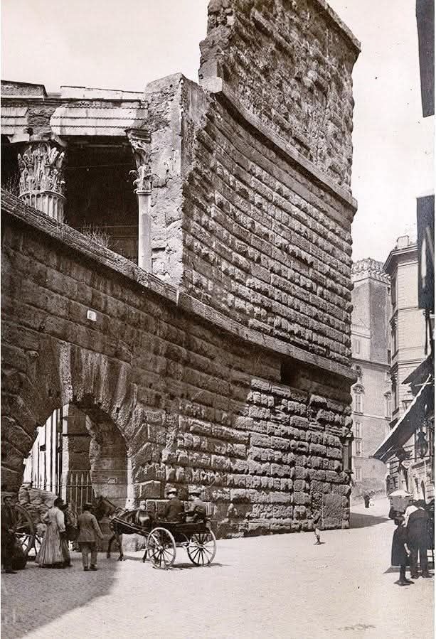 During the Middle Ages, the Forum of Augustus, being relatively low land surrounded by hills, became a swamp ("pantano"). The archway dedicated to Germanicus came to be known as Arco dei Pantani, the Arch of the Swamps, visible just to the right of the Temple of Mars Ultor in the 1st and 2nd photos below. It served as a passage between the Forums themselves and the Suburra neighborhood. The arch used to be open for the public to walk through. The 3rd photo below is from 1903. Isn't it interesting that the babes were once allowed much closer to the ruins than they are now, and how much excavation has been done since that picture in 1903? And even moreso, the 4th photo below (year unknown) shows that there were buildings on top of those marble floors in the Forum of Augustus! The 5th photo below shows the Arch of the Swamps from behind the back wall of the Forum of Augustus, on Via Tor De Conti (part of what once was the Suburra neighborhood), and the 6th photo below is a photo from approximately the same place from the Raccolta de Alvariis.